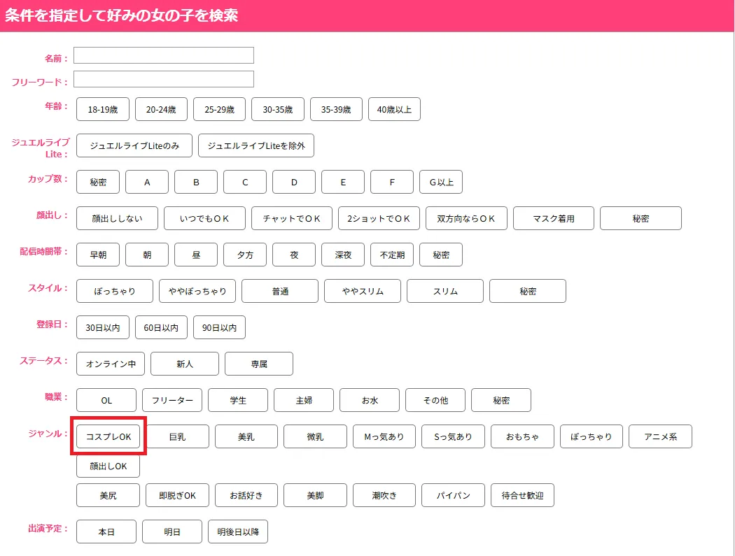 ジュエルライブにはコスプレをしてライブチャットをしている女性が多くいます。検索機能でコスプレしている女性を簡単に見つけられるのもポイントです。
