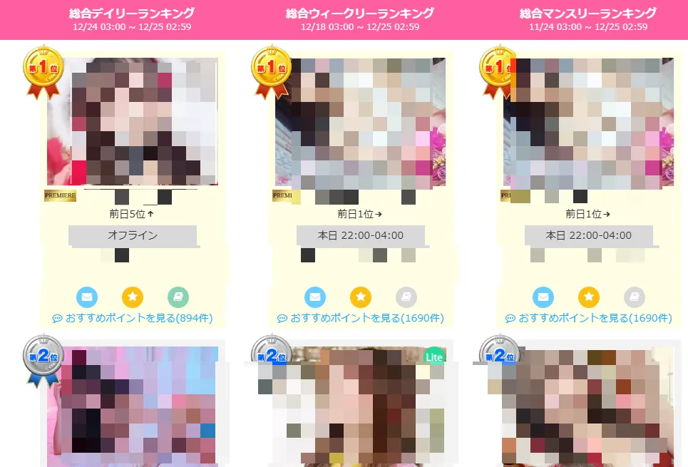 ジュエルライブでは、女の子のサイト内ランキングや口コミを無料で閲覧できます。ランキングと口コミ評判が高いほど、積極的である可能性も高いです。